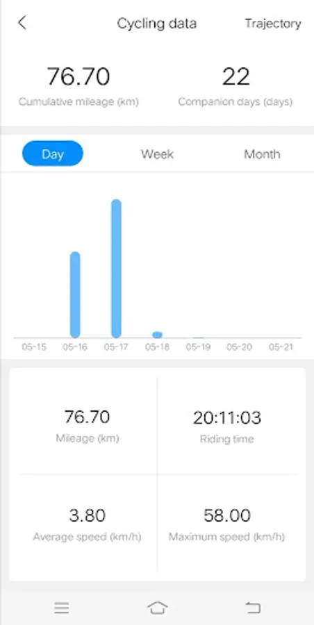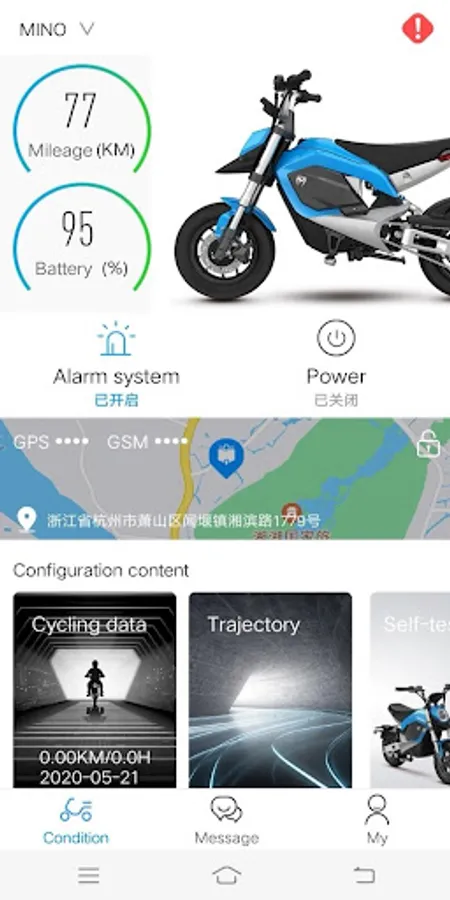 Vehicle condition: remaining power, remaining mileage, location, historical track and riding distance statistic data.