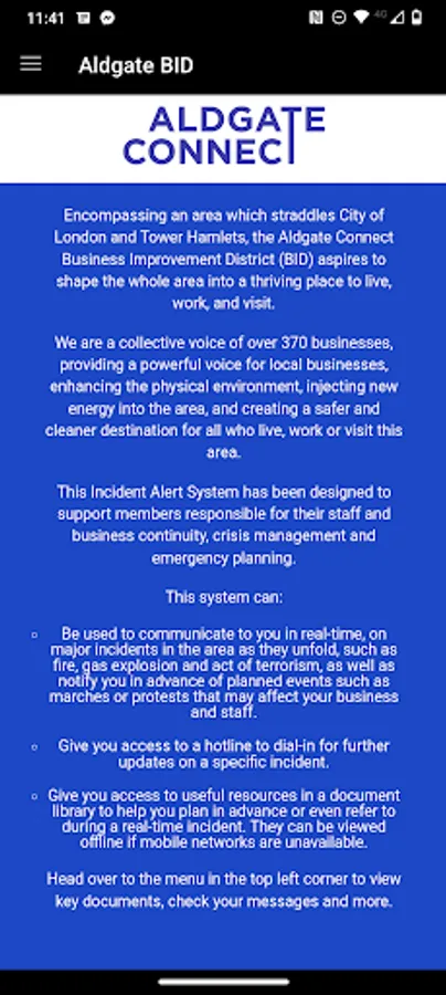 - Be used to communicate to you in real-time, on major incidents in the area as they unfold, such as fire, gas explosion and act of terrorism, as well as notify you in advance of planned events such as marches or protests that may affect your business and staff.