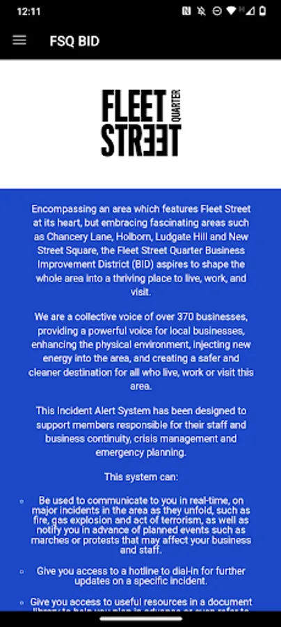 - Be used to communicate to you in real-time, on major incidents in the area as they unfold, such as fire, gas explosion and act of terrorism, as well as notify you in advance of planned events such as marches or protests that may affect your business and staff.