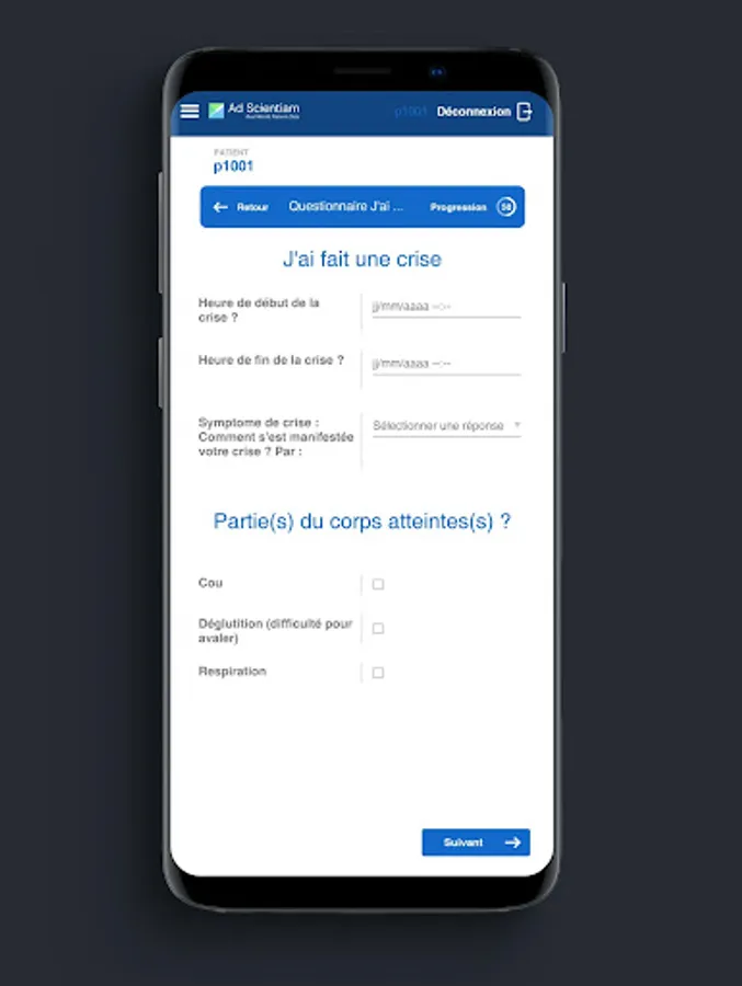 Developed with Pitié-Salpêtrière clinicians and patients, the Inclusia solution offers many features: complex and customizable questionnaires, multiple branches, notifications, photos taken, additions of attachments, voice recordings, etc.