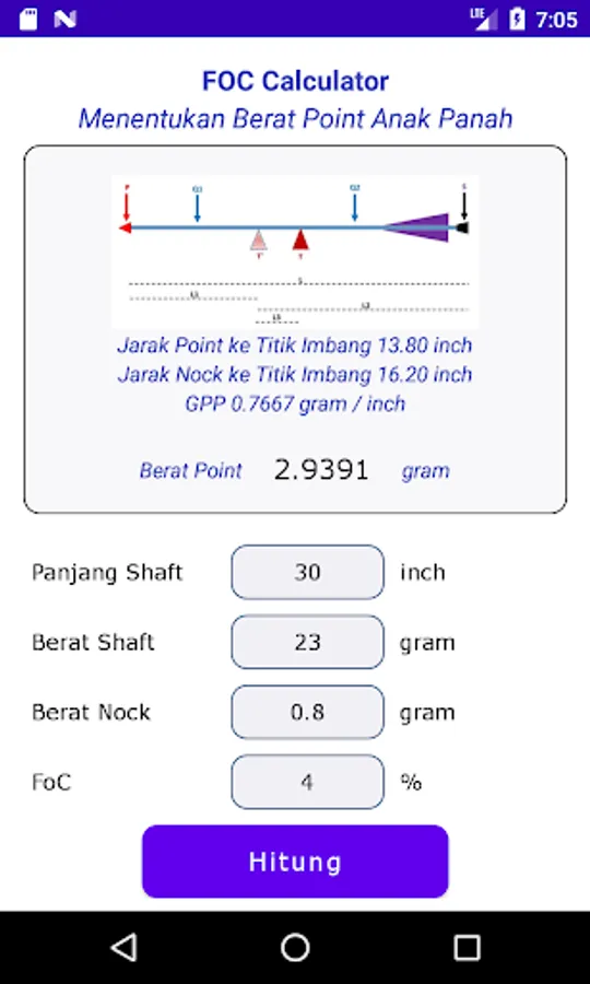 FOC Arrow Calculator is an application that is used to calculate the required arrow point weight. The length and weight of the arrow shaft and the ideal FOC Arrow can produce arrows that are very uniform so that they can get maximum results.