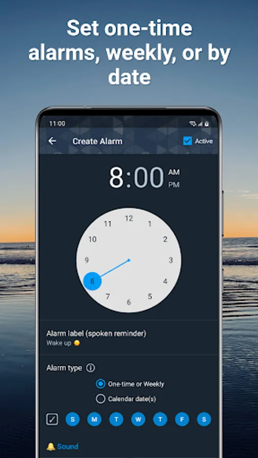 ✔ Alarm type: one-time, weekly repeat, or a specific date in the future