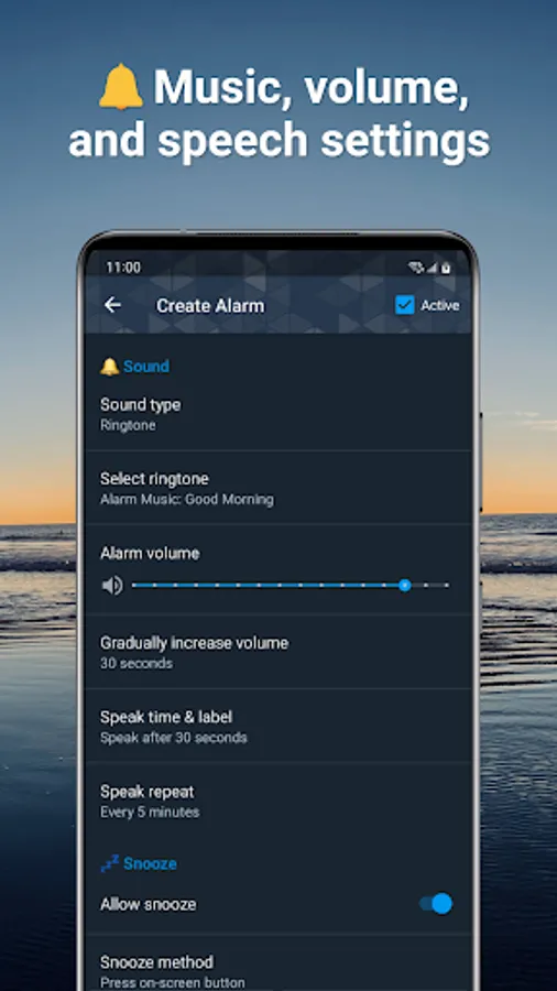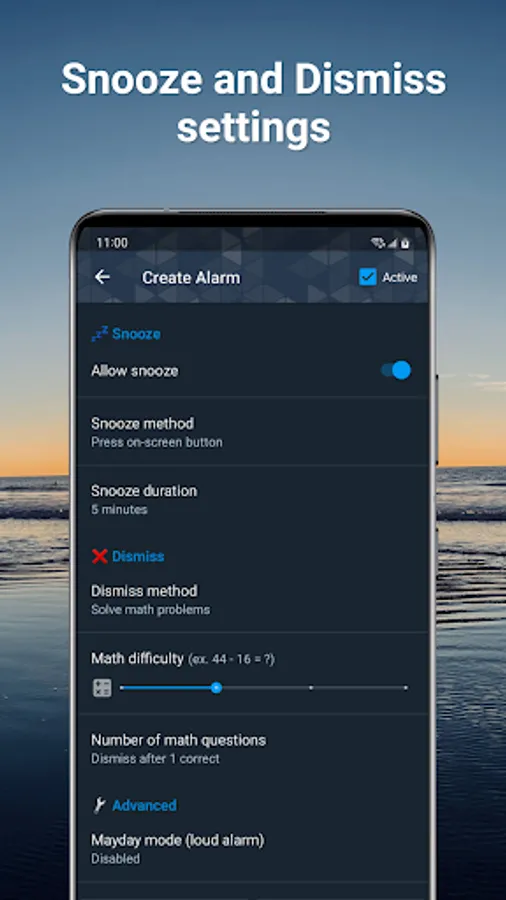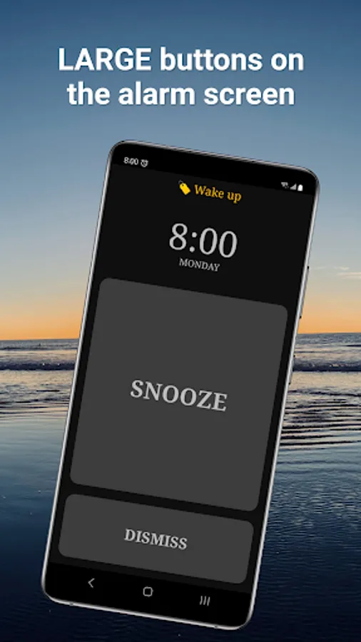 ✔ Snooze options: choose your snooze method, snooze duration, maximum # of snoozes, and auto-snooze duration (or disable snooze altogether)