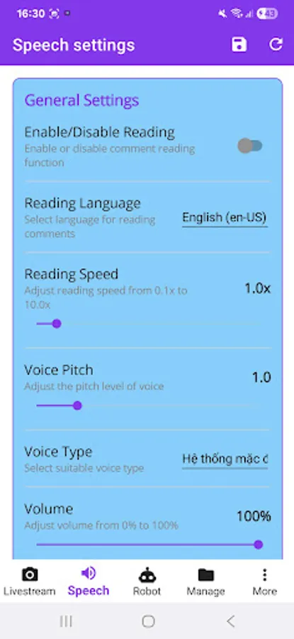 Lots of settings to read comments that you think are appropriate, avoid spam, many settings for reading voice, pitch, reading speed...