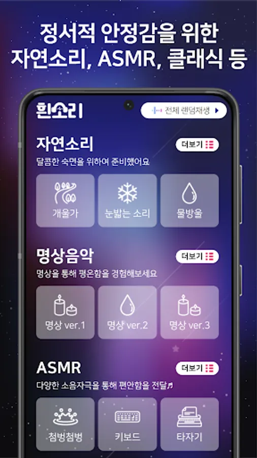 You can choose and listen to various sound effects that make you feel sweet sleep, comfort, and emotional stability according to your taste. In addition, experience stress relief and insomnia prevention through various white noise. In addition to all random play, you can set functions such as repeat play of one song separately. The effect of white noise that you have never experienced before, now experience it with the White Noise - Sleep Meditation Concentration App!