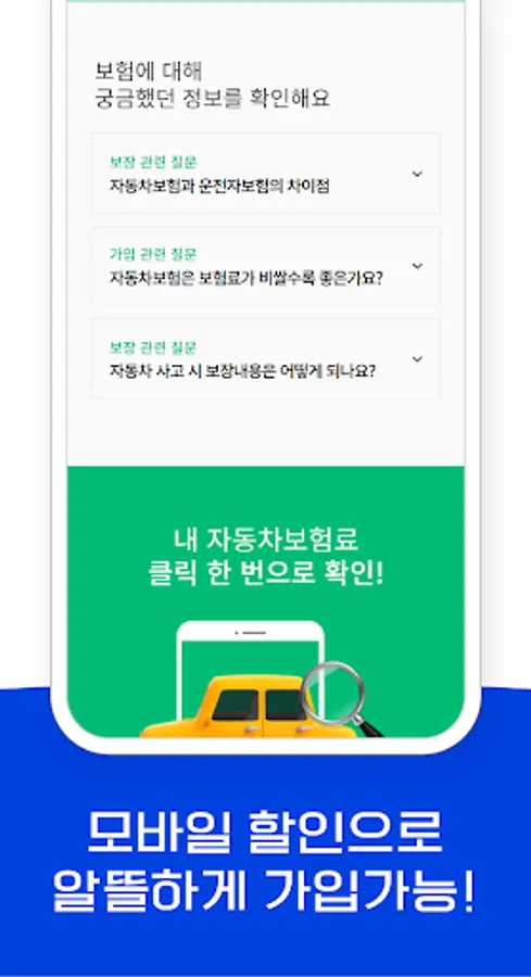 Compare car insurance products easily and quickly with the mobile app! You can check your car insurance premium anytime, anywhere, and compare car insurance products by insurance company in real time.