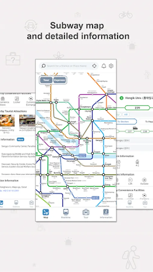 ▴ provide information on tourism attractions around a station and subway line map for Seoul’s famous tourism destinations