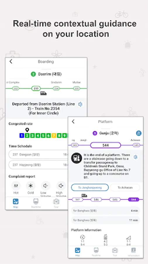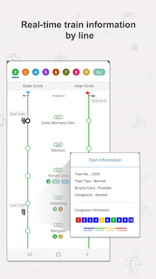▴ provide information of subway stations, notification of arrival station, congestion level of a train based on the current location