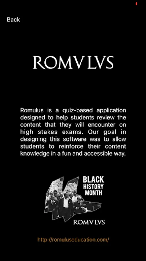 Romulus Black History Month is a quiz-based application of iOS devices designed to help students acquaint themselves with the subject of Black History.