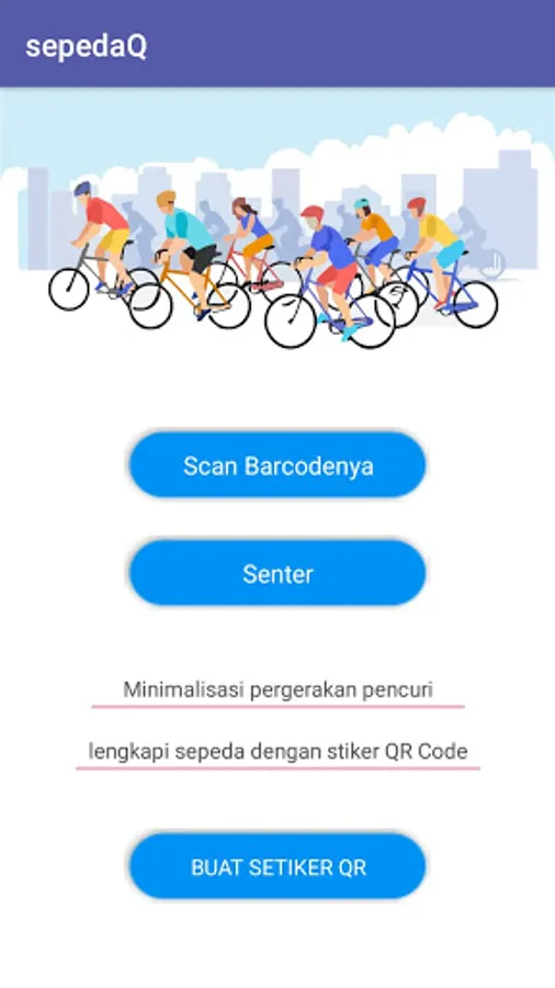 The SepedaQ application was made to support bicycle hobbyists. Application equipped with flashlight for night / dark tracks. The application is also equipped with a QR scanner to make it easier to read the QR barcode encountered by the cyclist. The application is also equipped with a QR sticker creation form to track the location of the bike, by using the community to scan QR Securty. This QR Security sticker is connected to the bicycle owner's google site account. So to increase the safety of the bicycle from theft.