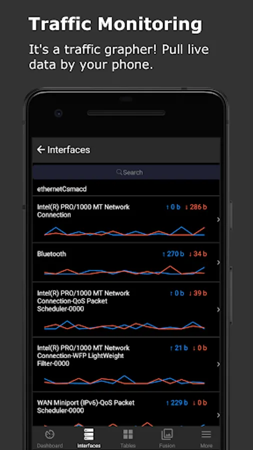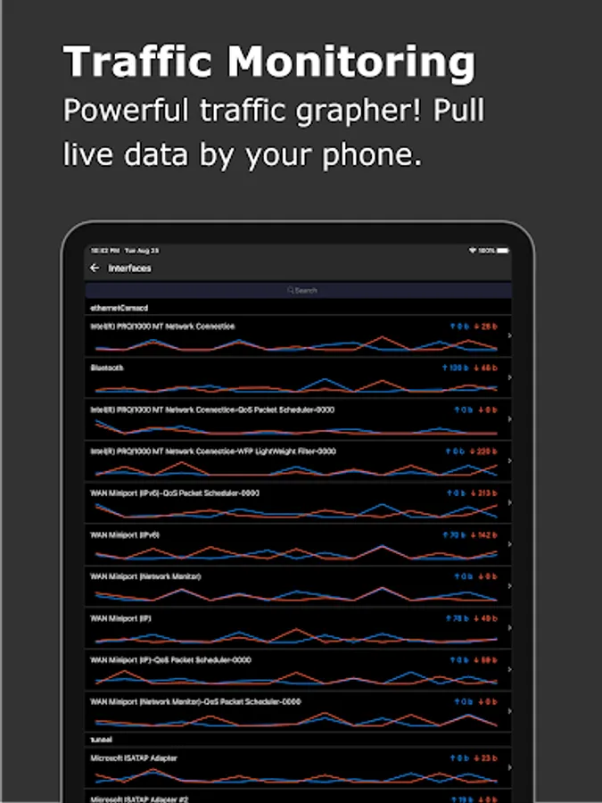 • Traffic Monitoring. Statistics interface types, show grid and pie chart. Live interface rate list, show last tx/rx and mini line chart. fetch interval is 3 seconds. Live interface detail view, show tx/rx last, max and average and large line chart.
