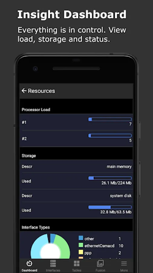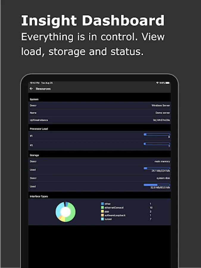 • Insight Dashboard. System information, description, name and uptime. Processor load, storage name, storage used size, storage total size and storage used percentage bar. Fetch interval is 3 seconds.