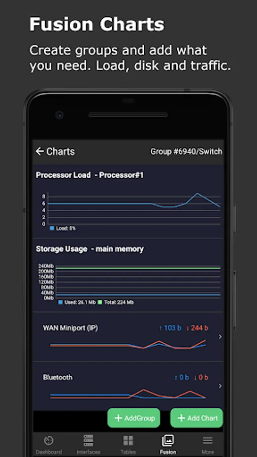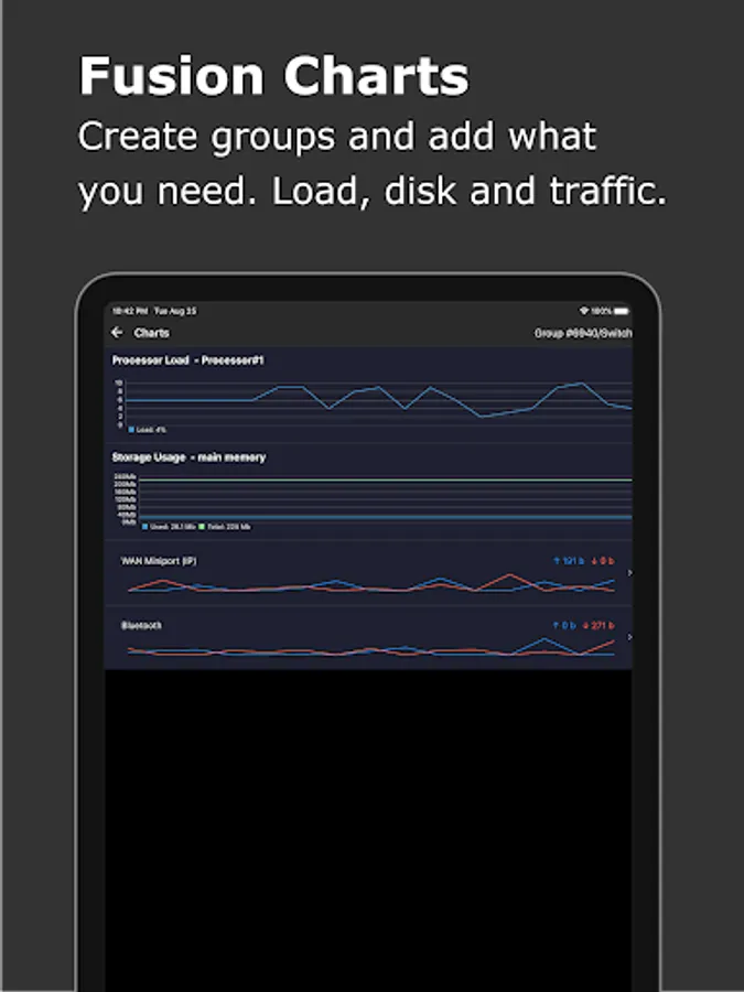 • Fusion Charts. Create chart groups and add what you need. For example, create a group with cpu load, memory usage, ether1 traffic rate and wlan traffic rate.