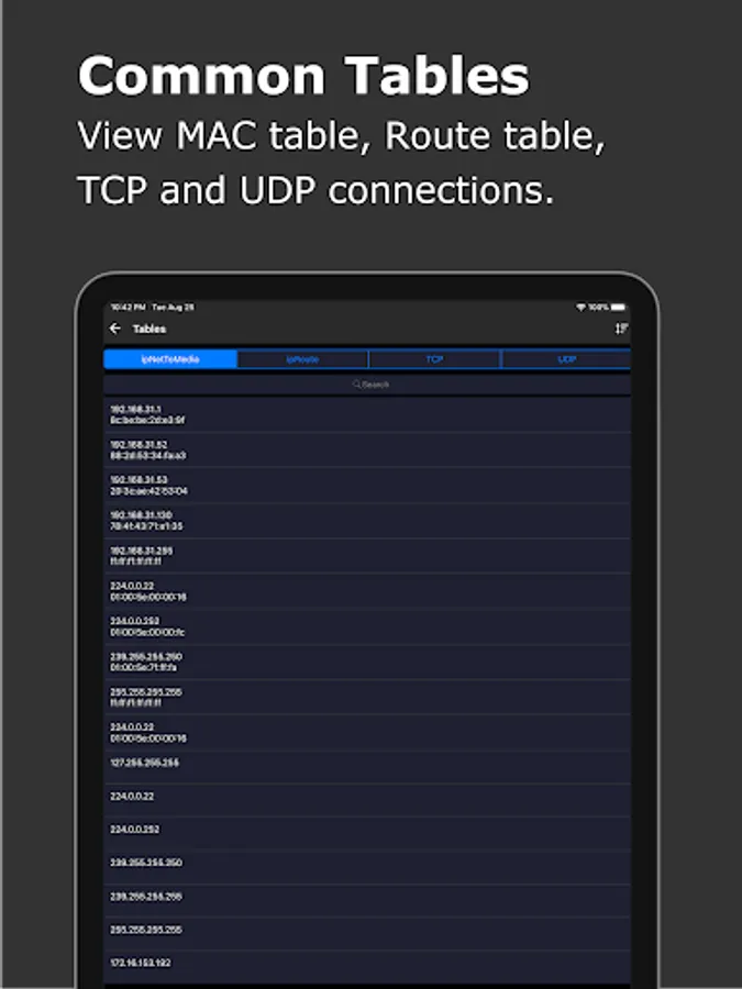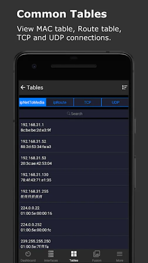 • Common Tables. TCP connections, show from/to address and port. UDP connections, local address and port. MAC table(ipNetToMedia), show MAC(PhysAddress) and ip(NetAddress). Route table(ipRouteTable), show ipRouteDest, ipRouteNextHop and ipRouteMask.