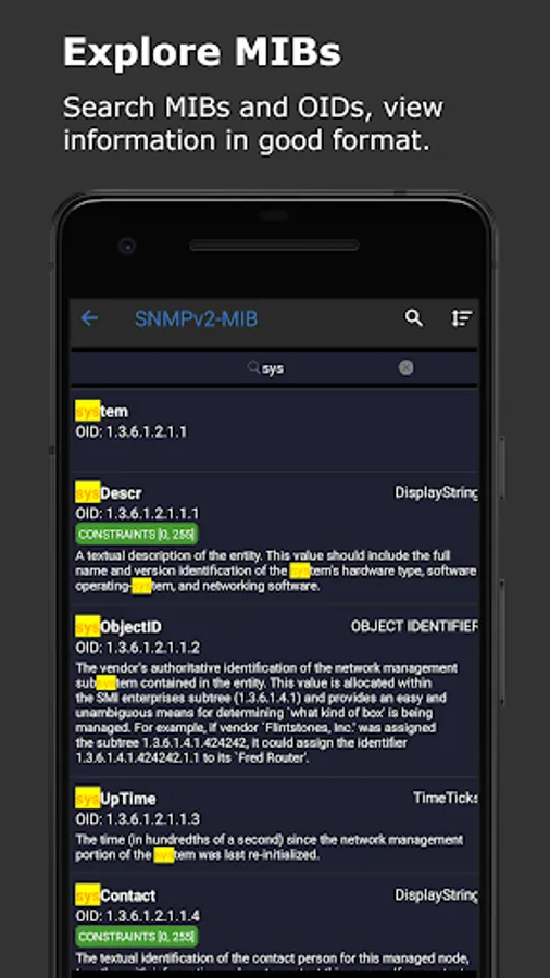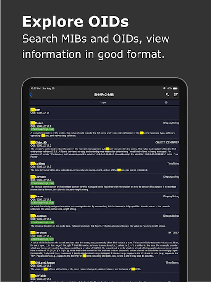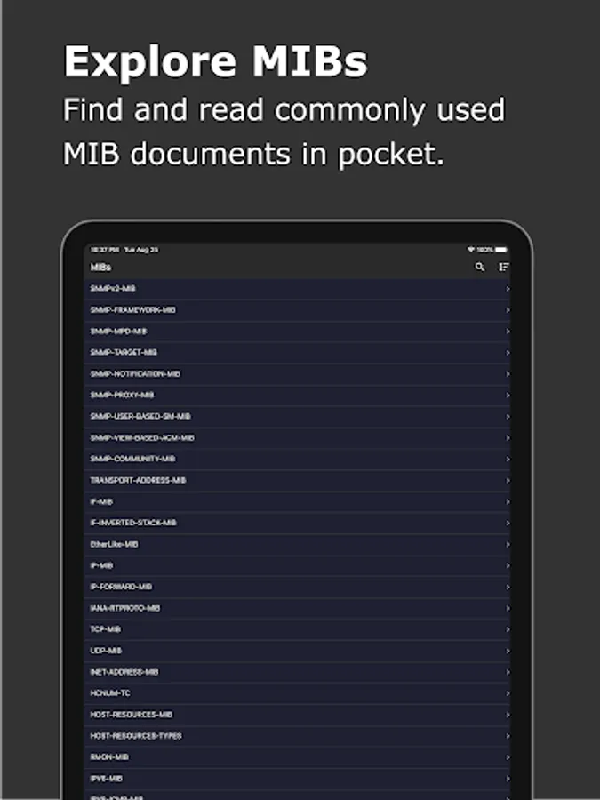 • MIB explorer. The app includes commonly used MIBs. Search MIB or OID information, view detials in good format.