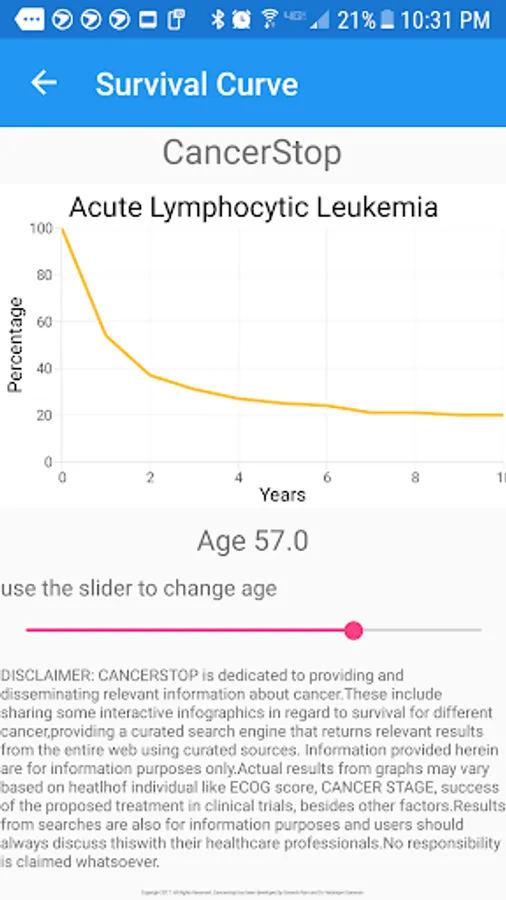 This feature is an interactive tool that presents the survival curve for a given cancer and age of diagnosis. Actual results from graphs may vary based on health of individual like Tissue grading and staging (in case of solid tumors), ECOG score, success of the proposed treatment in clinical trials, besides other factors. These represent typically observed survival rates as culled from the NCI’s SEER program. As medical research and technology advances further and the standard of living improves these are very likely to change. Numbers for these curves are for information purposes only. NO RESPONSIBILITY IS CLAIMED WHATSOEVER.