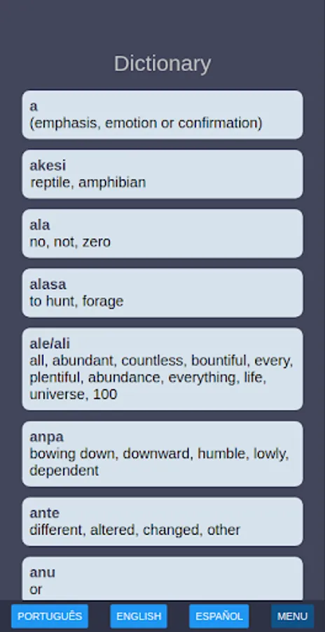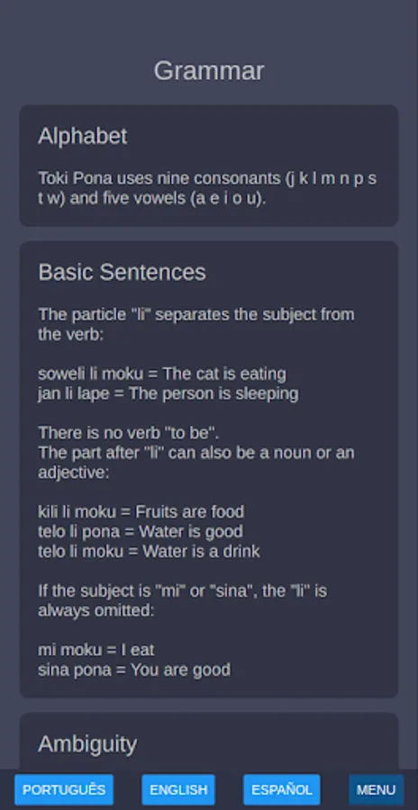 It is a minimalist language, composed of only 14 phonemes and 120 words (currently there are some other unofficial words).