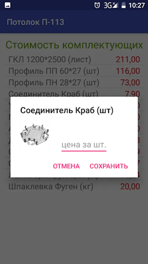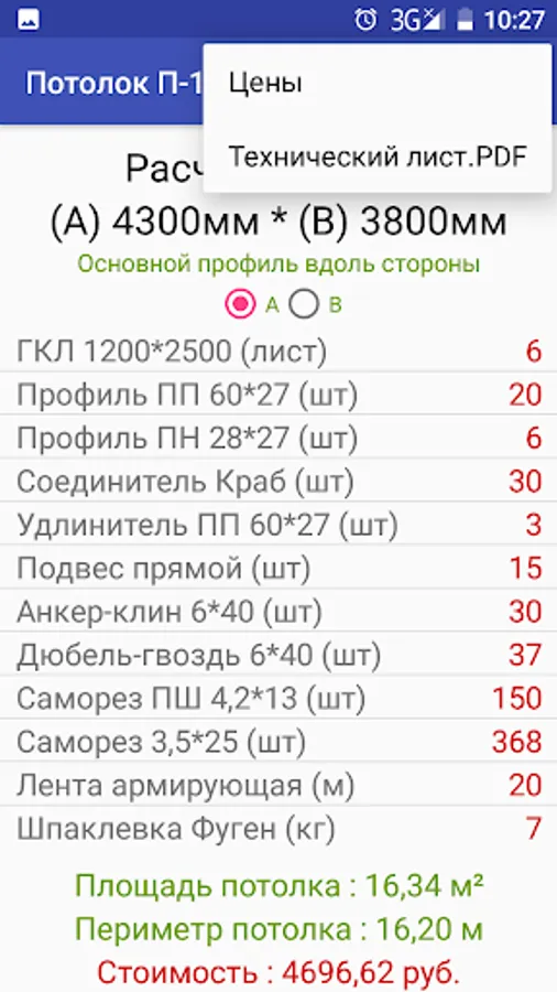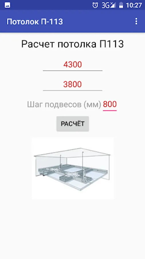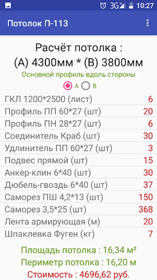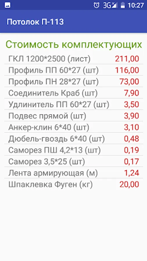 Program for calculation of components and the cost of the ceiling U-113 from the drywall Knauf technology.
