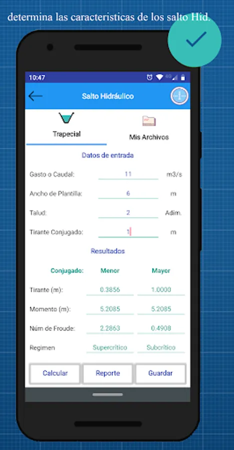 v) Hydraulic Jump: determines the characteristics of the hydraulic jump, the conjugate braces, moments, etc.