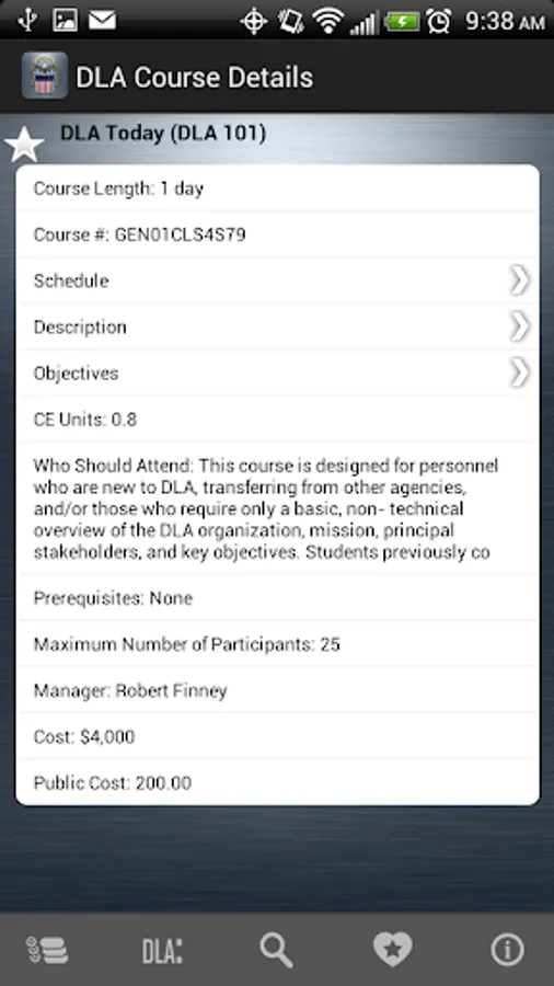 Defense Logistics Agency (DLA) Training has over 120 courses in a variety of formats for obtaining technical, professional, and managerial training. The DLA Mobile Course Catalog App allows learners to search for, sort, and tag DLA courses they are interested in taking. It provides course schedules, registration details, contact information, driving directions, and general information about DLA Training.