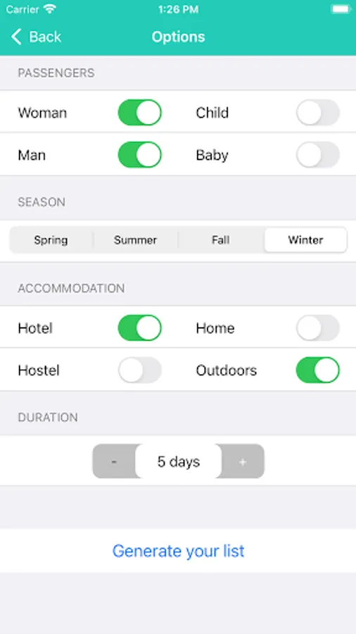 The distinguishing feature of the app is its' ultimate simplicity. You just spend 5 seconds to pick passengers, your preferred accommodation and the duration of your trip. Then you receive a list of recommended objects to take with you.