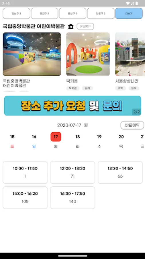 Various institutions and local governments, such as the National Museum of Korea, Seoul-type kids cafes, and children's indoor playgrounds in Gangnam-gu, operate facilities for children that can be used with high quality and at low prices. It is configured so that you can see the reservation availability of these facilities in an integrated manner.