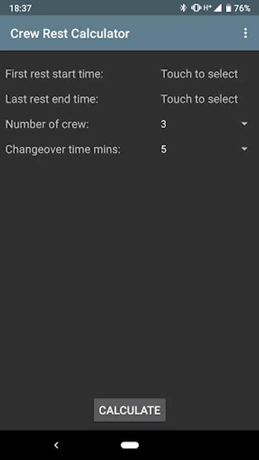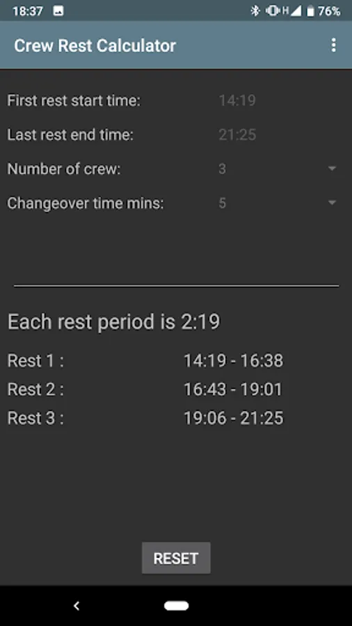 Crew Rest Calculator has been developed with airline crews in mind, but it will work perfectly for all kinds of shift-workers who need to share rest and break periods evenly. It's been developed to be easy, clear and lightning-fast. Includes a dark grey theme to preserve night vision!