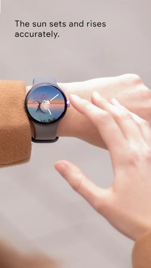 Sunsets and sunrises are shown accurately based on location. The visual representation of the sun rises exactly at the time of sunrise. The sun will continue its rising exactly until solar noon, when it reaches its highest point on the watch face dial. As the day passes onwards, the sun approaches the horizon, and disappears exactly at sunset time. Once the visual representation falls into the night, the moon will rise with the stars as the sky gets gradually darker.