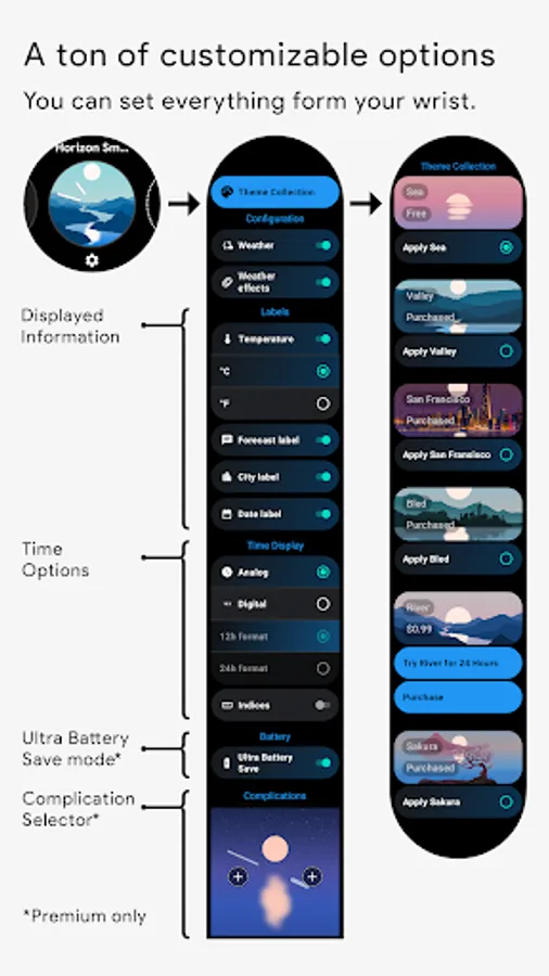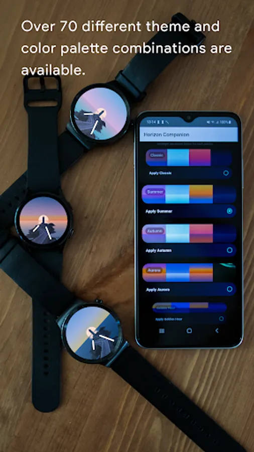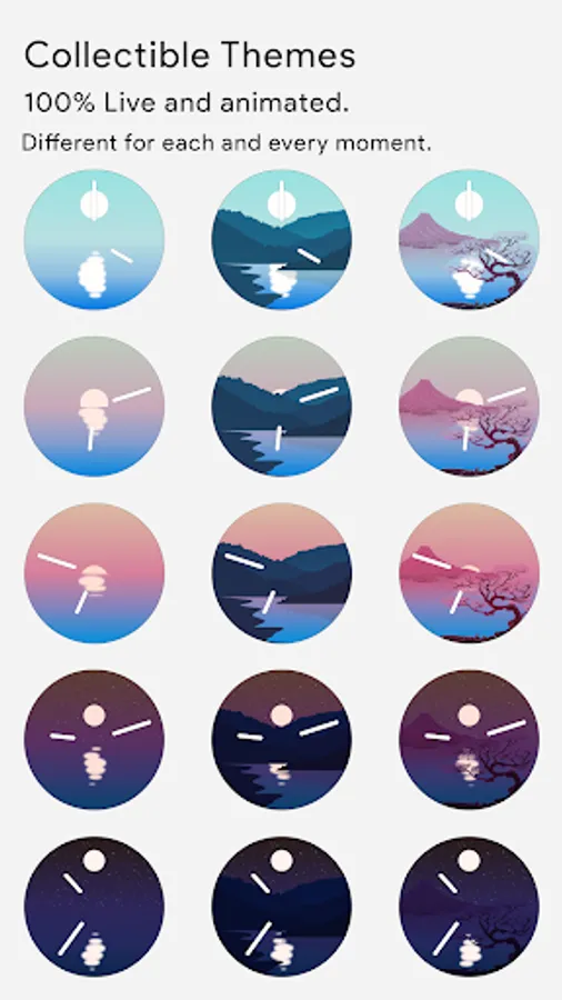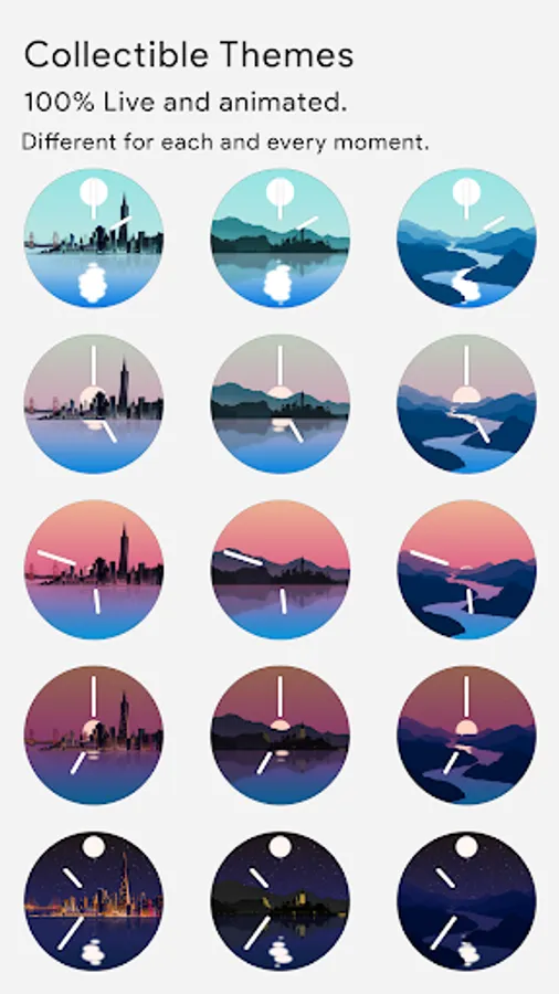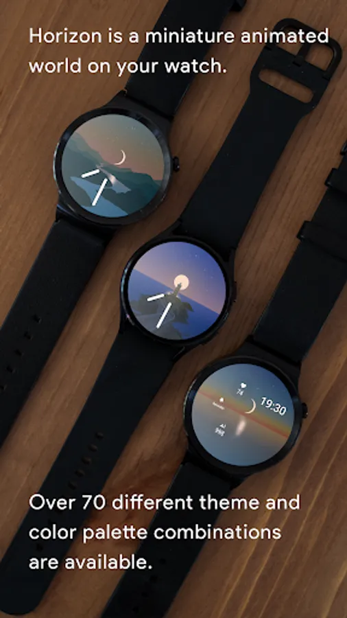 Horizon is a miniature animated world on your smartwatch, where every second of the day has its distinct representation. Over 210 different theme and color palette combinations are available.