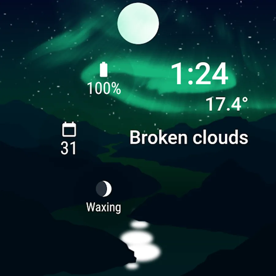 The gradient palette of the backdrop can be customized. A palette contains a keyframe colour for sunrise, noon, sunset and midnight. These keyframe colours transition into each other as time passes - as a result, every second has its own unique representation.
