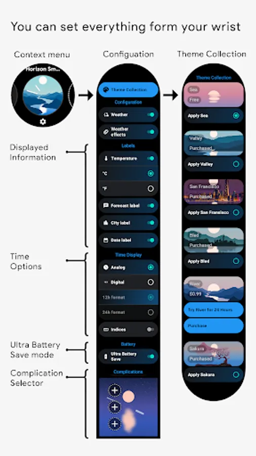 Horizon is a miniature animated world on your smartwatch, where every second of the day has its distinct representation. Over 180 different theme and color palette combinations are available.