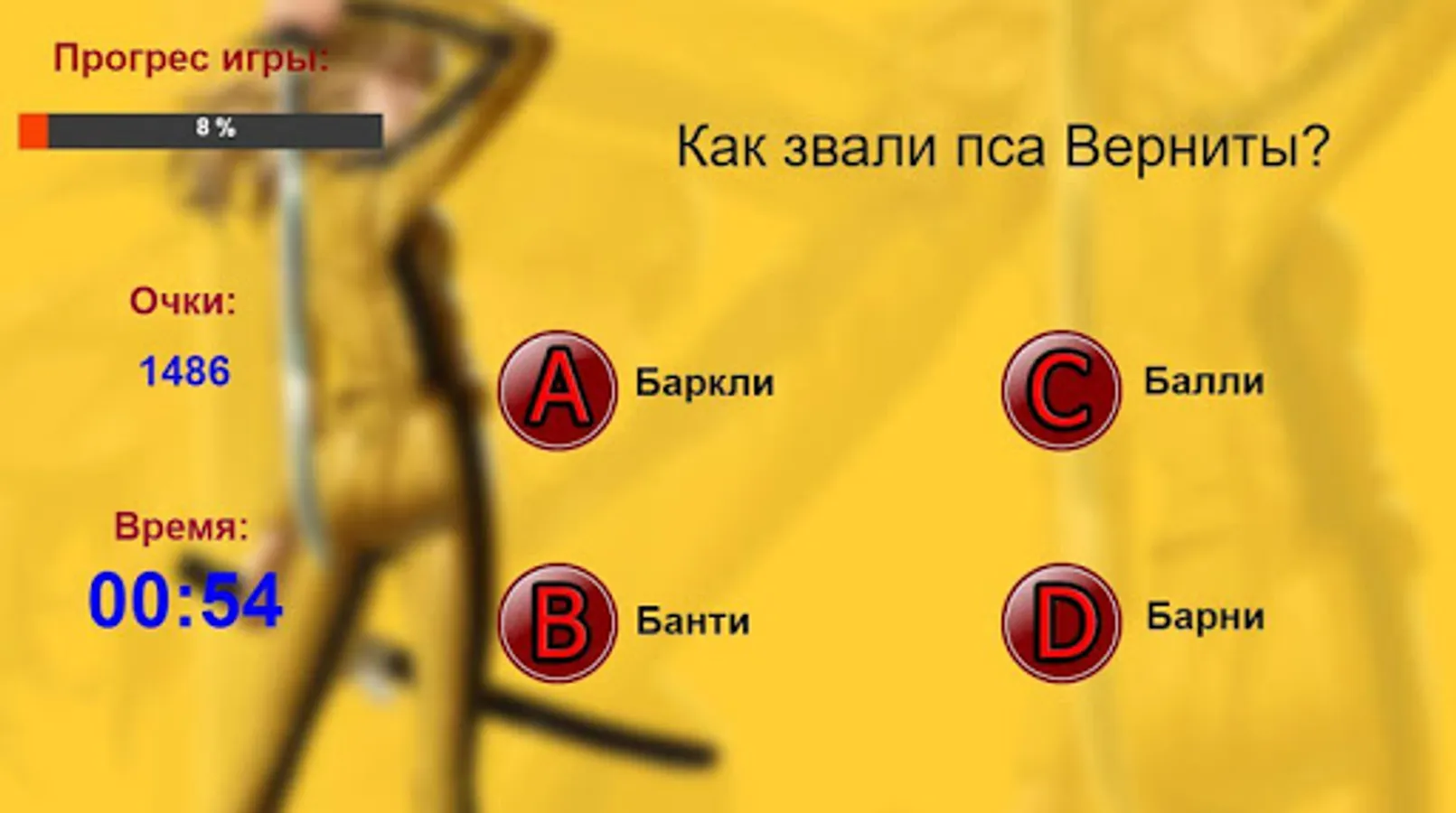 Dedicated to all fans of the cult action movie ... A quiz game. Test your knowledge of the movie "Kill Bill." Answer all the questions and score as many points as possible. The faster you answer, the more points you get.