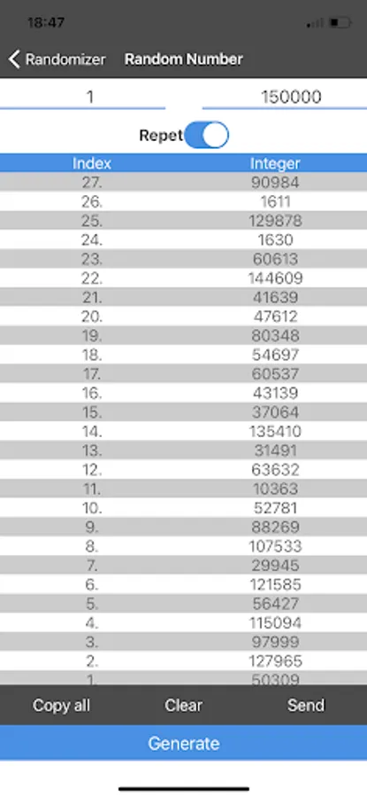Generate random numbers in any range. It is possible to disable repetitions of random numbers. All random numbers are added to the list and numbered.