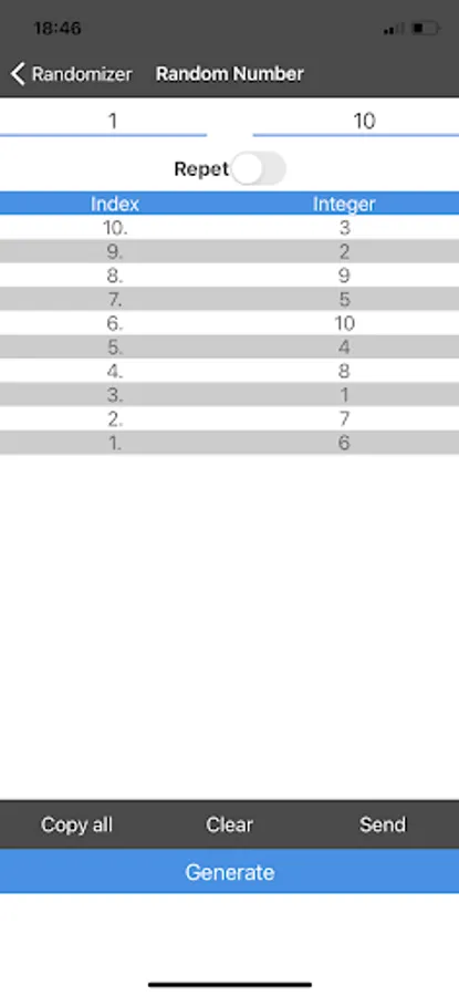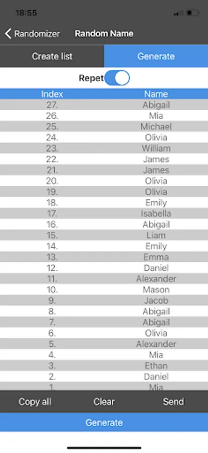 You can generate random numbers or random names without repetition. To do this, set the "repeats" switch to the "off" position.