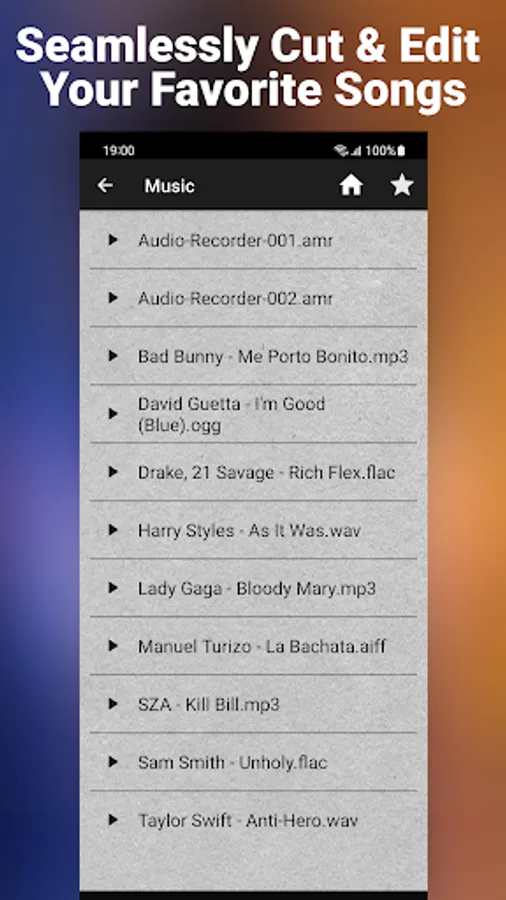 Take full control of your songs with advanced audio cutter tools. Use the fade in and fade out music editor for smooth transitions, adjust the EQ, bass, and treble controls to your liking, and give your tunes a boost with volume boost feature.