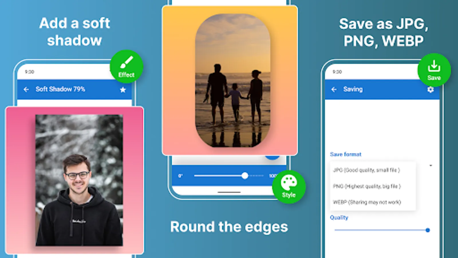 No Crop Square Pic offers a variety of Instagram photo fit options to help you get the perfect picture crop. You can picture crop to all possible aspect ratios to get the exact Insta square fit. The Instagram crop pictures app offers additional features to remove the white border, like scaling your photo, soft shadows, and rounded corners to your Instagram photo fit.