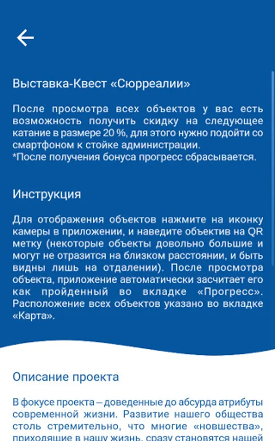 We present you our augmented reality application. The exhibition-quest is held on the territory of the Snezhny ski resort. You are invited to find all virtual sculptures and get a nice bonus.