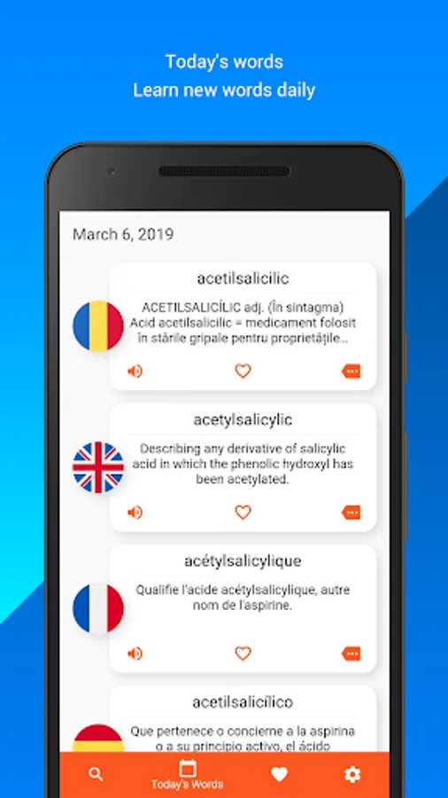 Scenario no. 3: You wish to learn a new word daily. For this, the app provides you with the "Today's Words" section. You may also receive a daily notification to remind you of these!