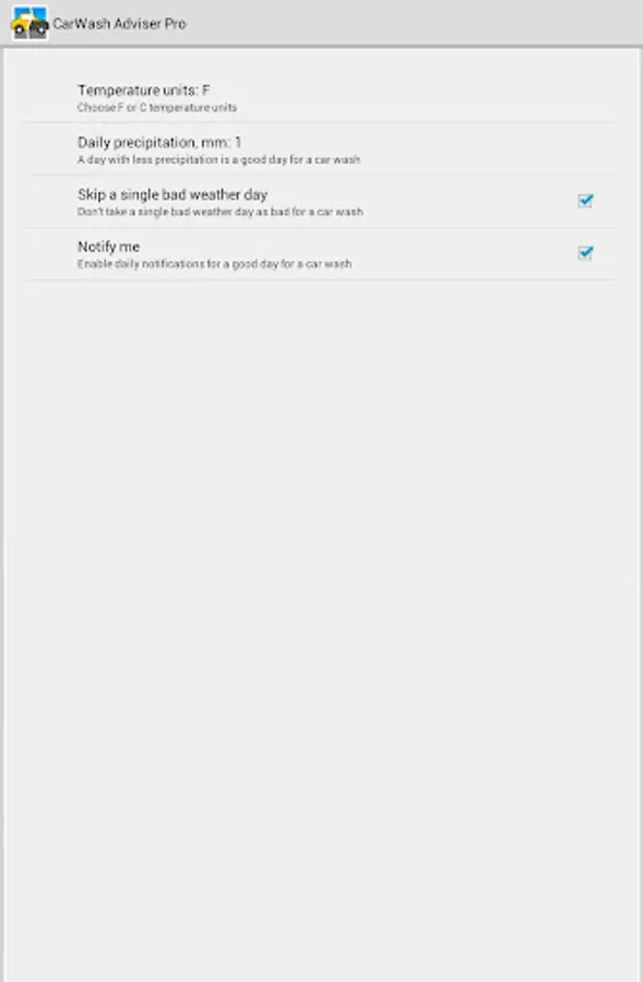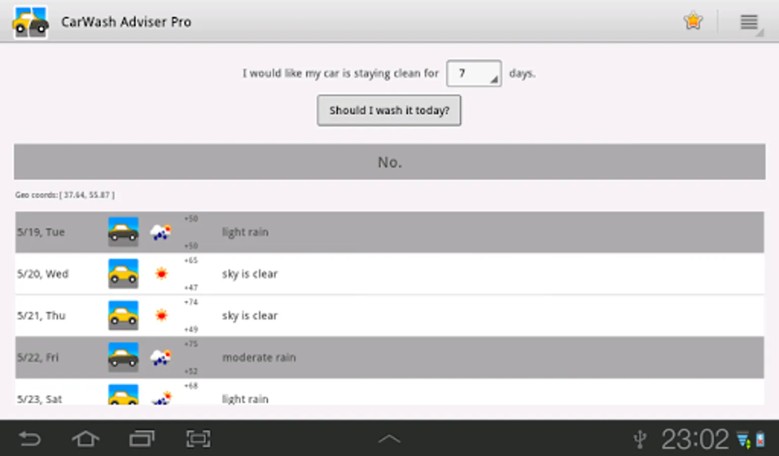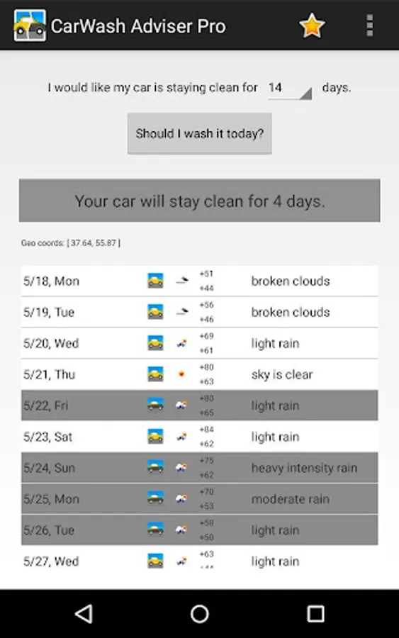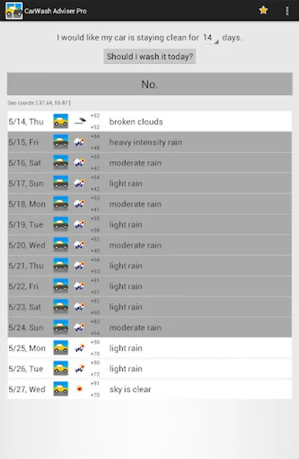 To wash or not to wash? This application will help you to choose the day to wash your car to keep it clean as long as possible. The program analyzes the weather and makes recommendations when to wash your car. Save using carwashes!