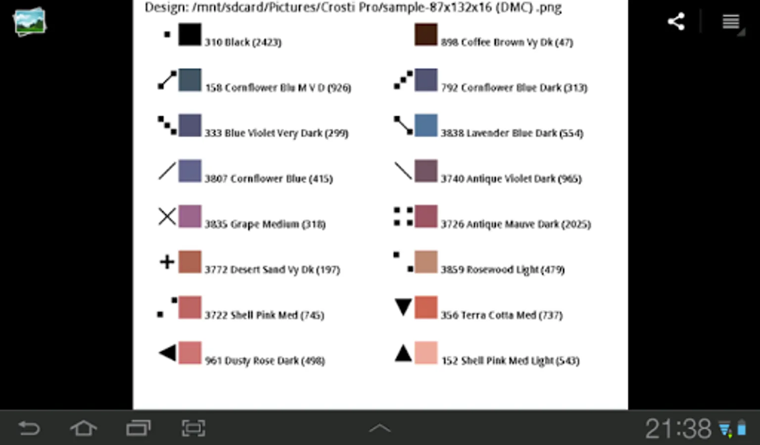 This simple tool allows you to create your own cross stitch design from image using popular DMC, Anchor or Gamma flosses color palette. Just open image, select design and hit Create. Created design will be saved as image and should be opened in the gallery.