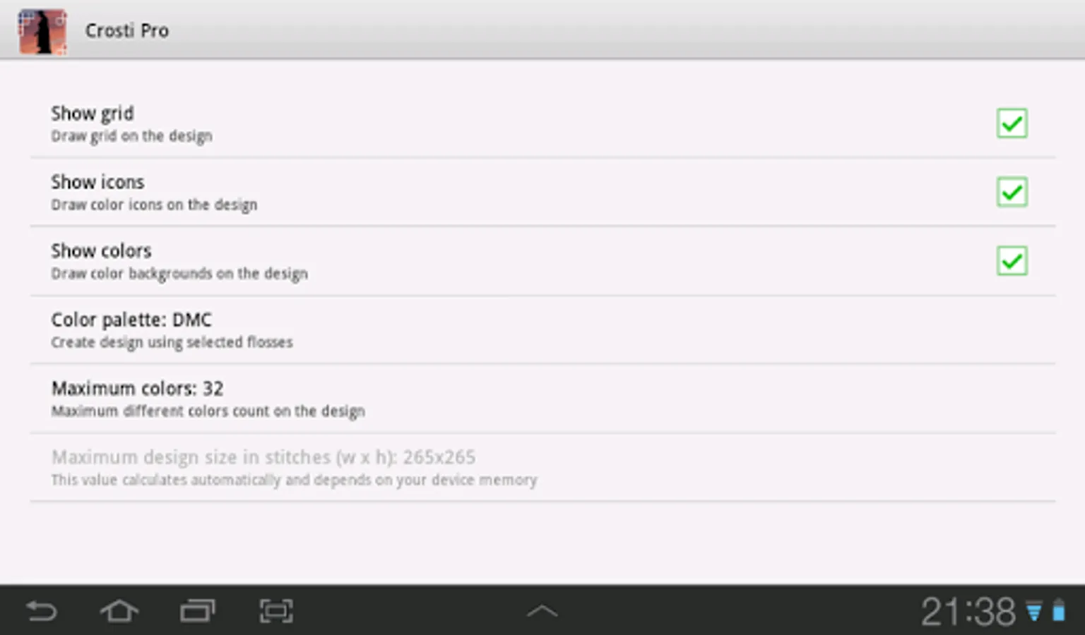 This simple tool allows you to create your own cross stitch design from image using popular DMC, Anchor or Gamma flosses color palette. Just open image, select design and hit Create. Created design will be saved as image and should be opened in the gallery.