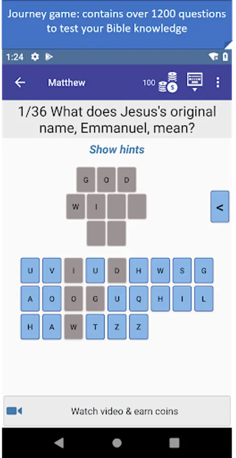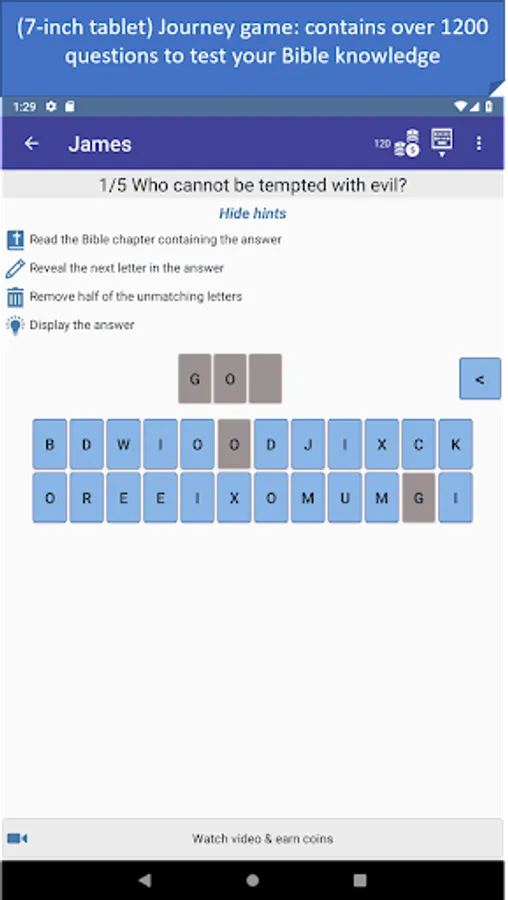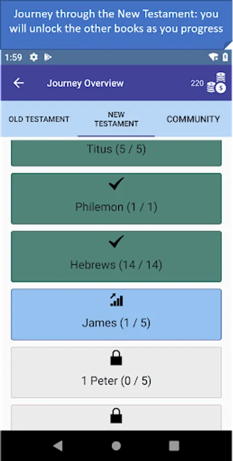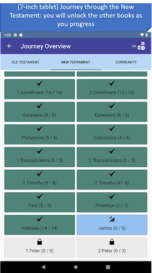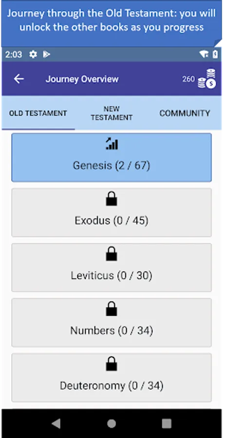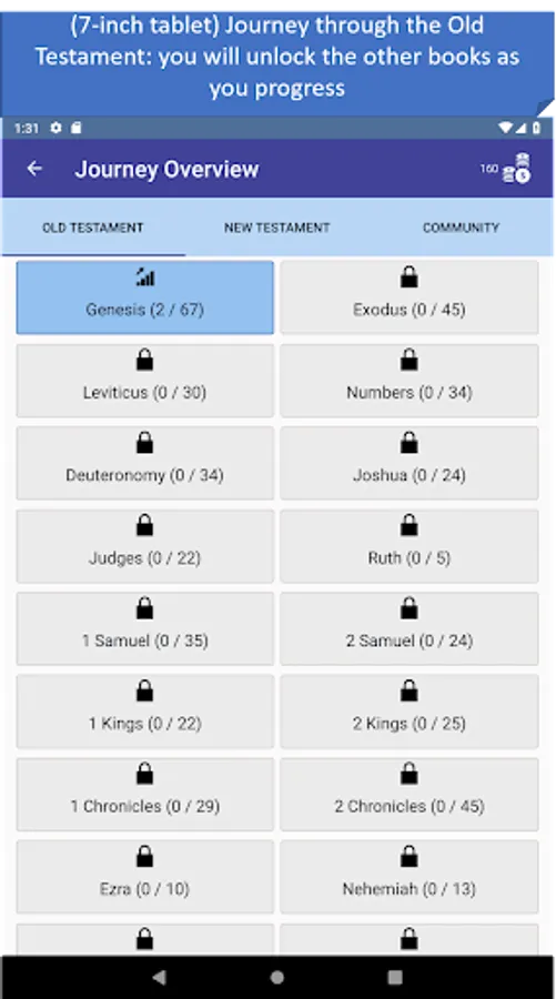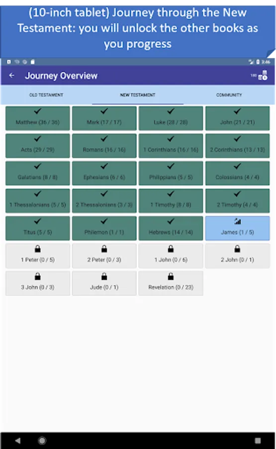 - Journey mode: a trivia mode that starts from the first book of the Bible and unlocks other books as you progress! You can play the Old Testament and New Testament at the same time. Contains over 1200 questions. With the new community feature we keep adding new questions from the list of suggested questions by the community, which provides an ever-growing database of questions.