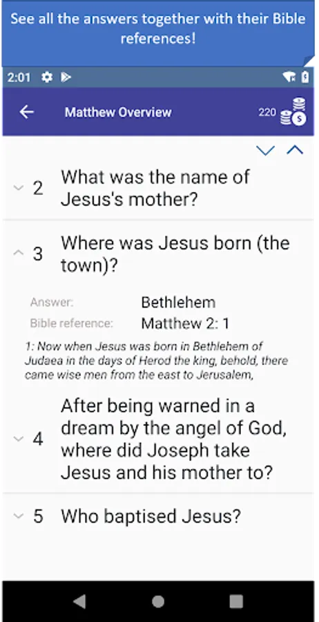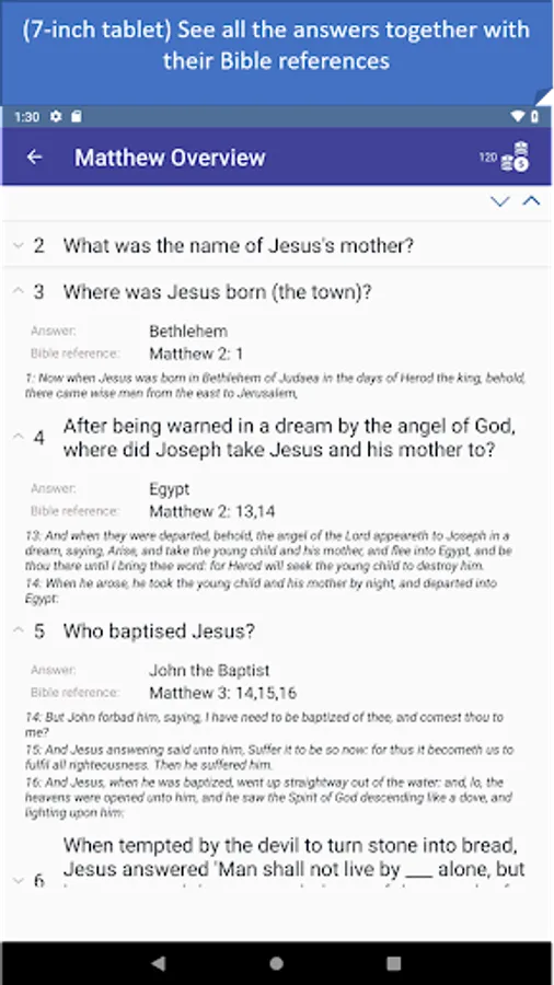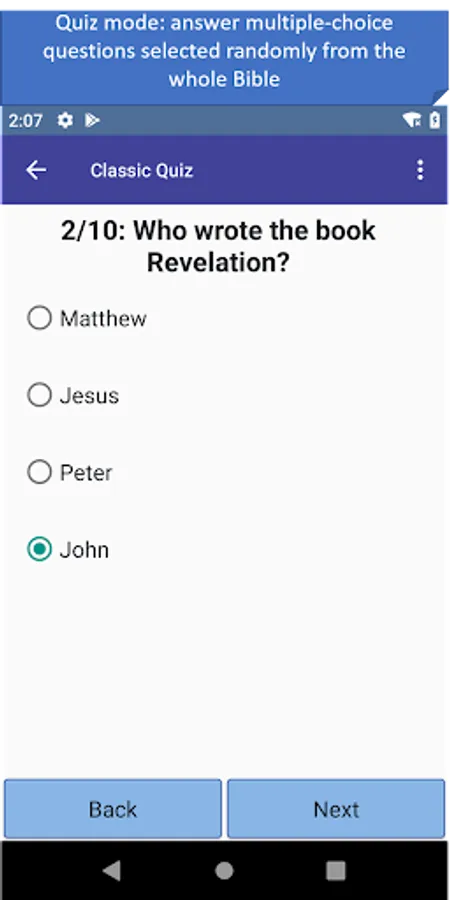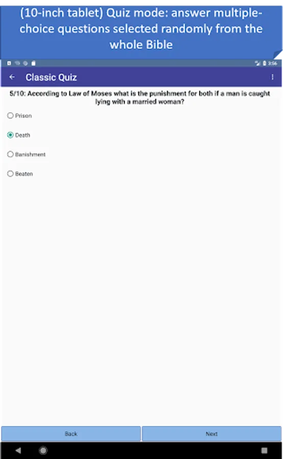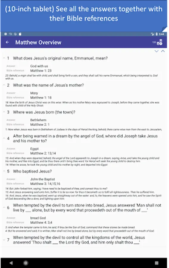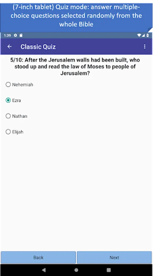- Quiz mode: in 3 different quiz types answer multiple-choice questions randomly asked from the whole Bible. Contains over 400 questions.