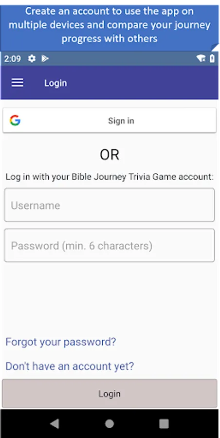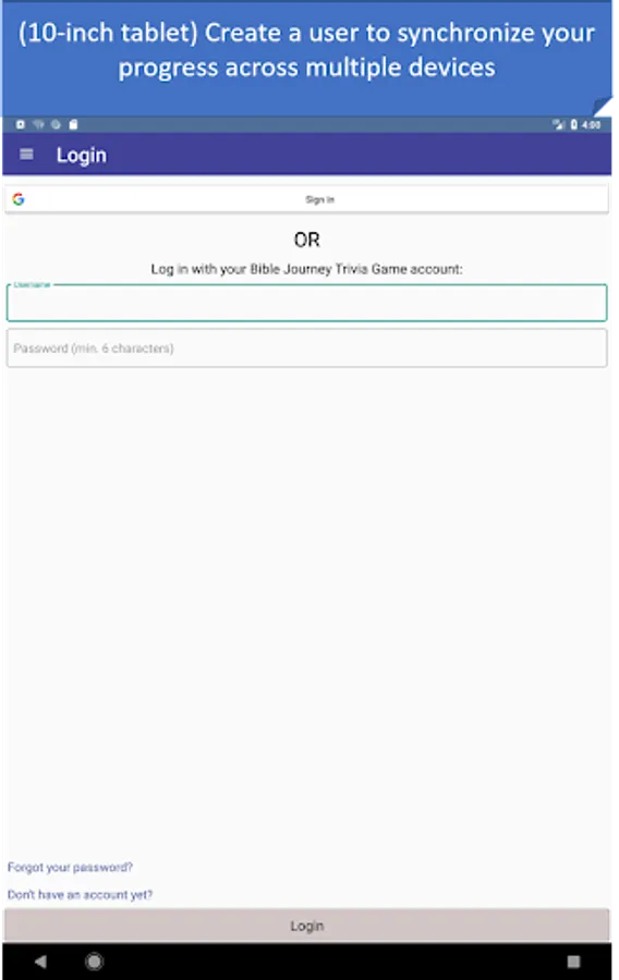 - Manage your account: create a user or sign in with your Google account, and synchronize your Bible Journey Trivia Game data across multiple devices.
