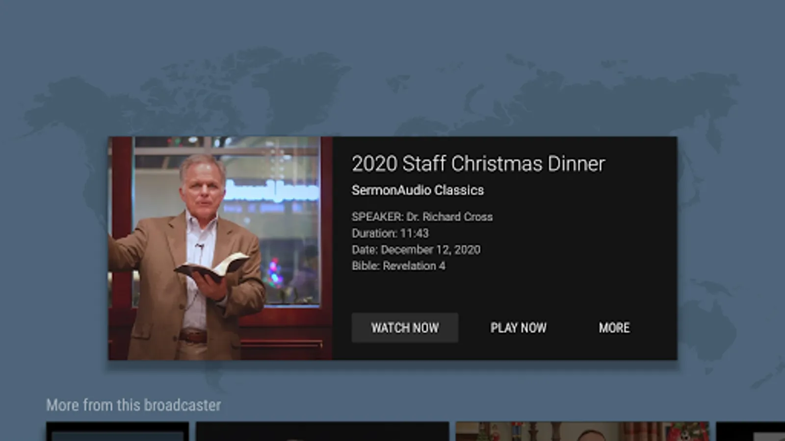 Enjoy the world's largest library of free audio + video sermons from thousands of different speakers, along with live webcasts, on your Android TV!