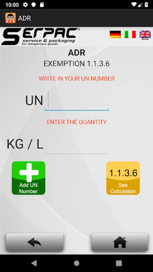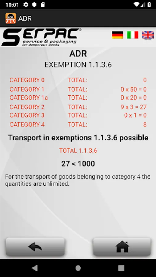 - the calculation 1.1.3.6 showing, based on the UN numbers entered by the user, if it is possible to transport with exemption and the calculation to verify it;