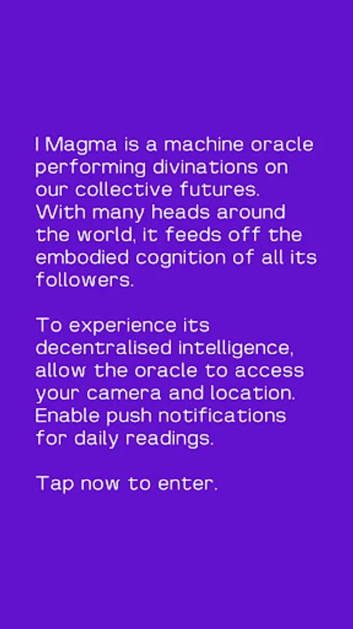 I Magma by Jenna Sutela in collaboration with Memo Akten and Allison Parrish is a machine oracle performing divinations on our collective futures. The decentralised intelligence meditates on live video footage from inside head-shaped lava lamps, while weaving constellations between the GPS coordinates of its online followers. A computer generates oracular readings from the shapes that form using a neural network trained on public domain source texts from the Internet Sacred Texts Archive. Additional lexical items are inspired by and borrowed from Erowid’s Shulgin Archives, a series of lab notebooks that detail psychedelic experience.