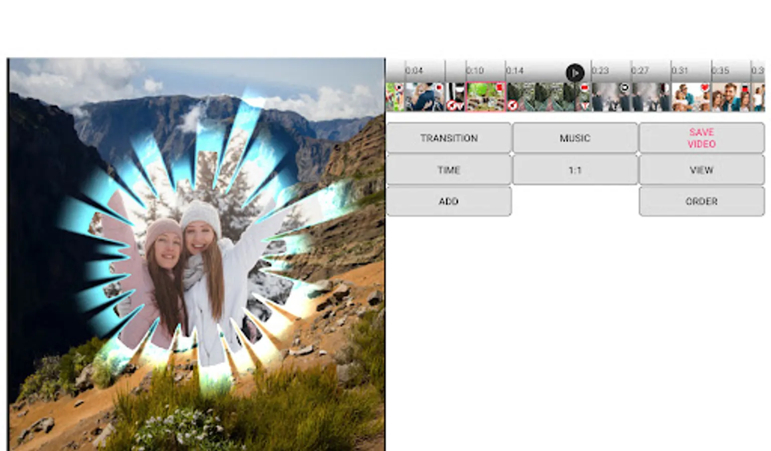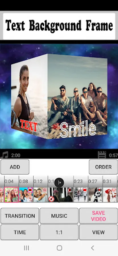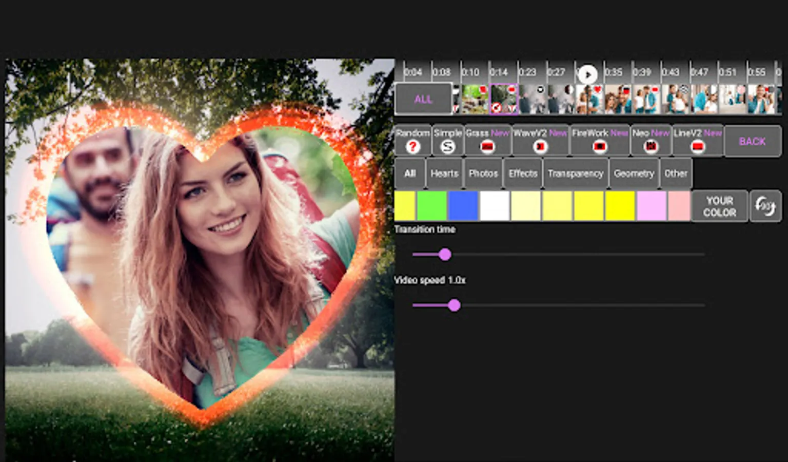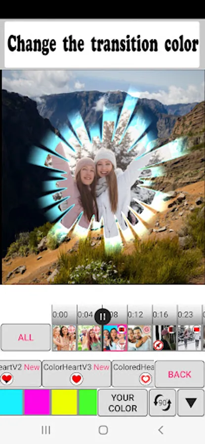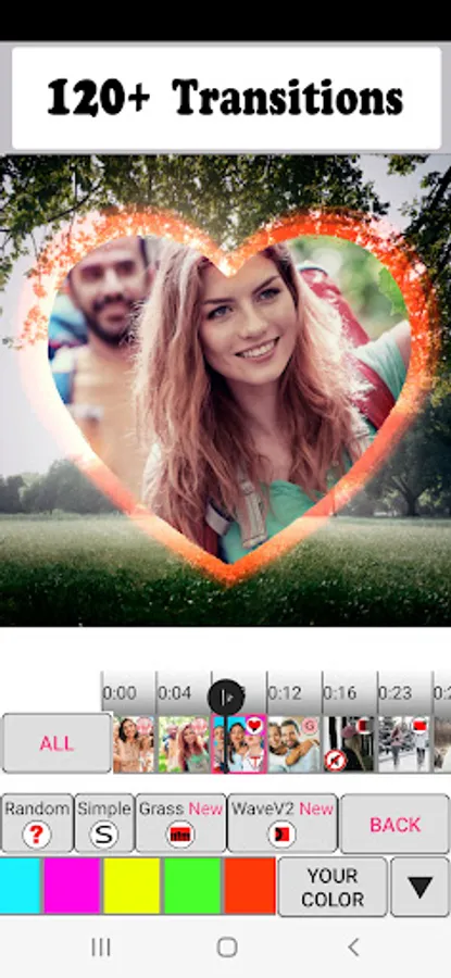 The "Photo Video Maker & Music" app allows you to choose your transition for each photo and video. The app offers more than 100 beautiful transitions: page flip transition, kaleidoscope, heart, drops on glass, 3d cube, transparent transition and many others. Transitions look beautiful both in photos and videos.