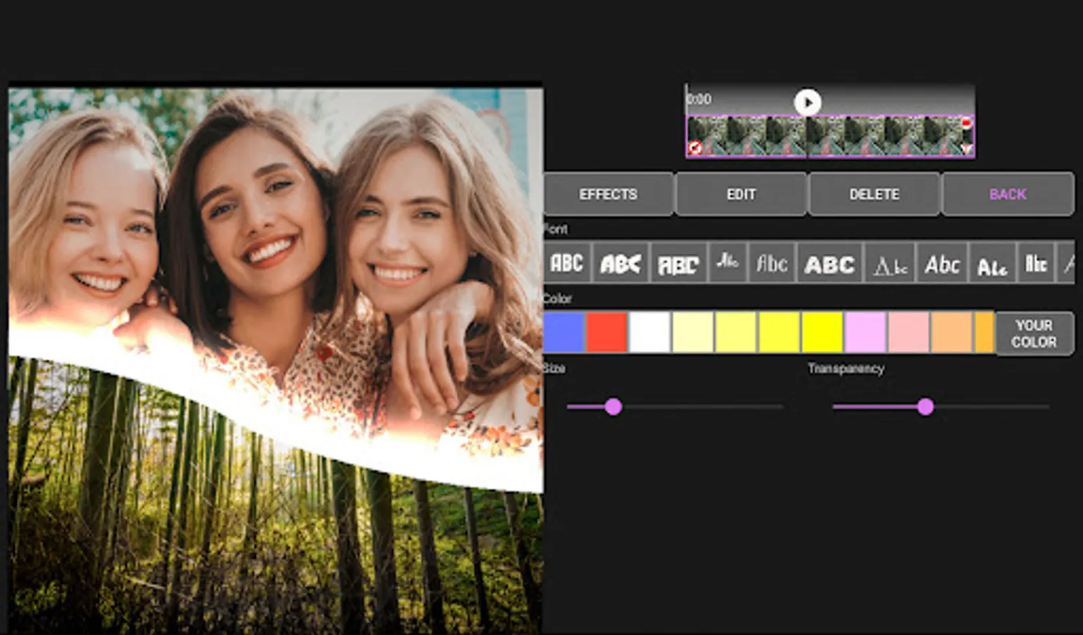 You can add text to each photo or clip. For text, you can customize the text colour, font (English fonts are available), shadow, stroke, background, etc.