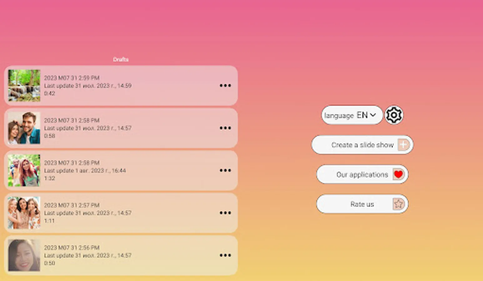 The photo and video maker does not need the Internet to work. Your photos and videos do not need to be sent to the server to create a finished video. All the work of the app takes place locally on your phone or tablet. We strive to keep your confidential data safe.